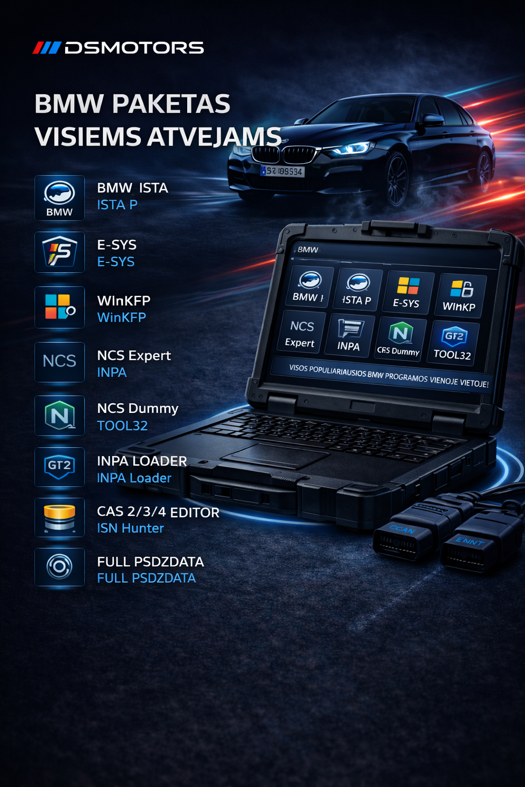 Pilnai paruoštas ir sukonfigūruotas kompiuteris, skirtas darbui su BMW automobiliais. Visus darbus galėsite atlikti patys – diagnostiką, programavimą ir kodavimą E, F ir G serijai.